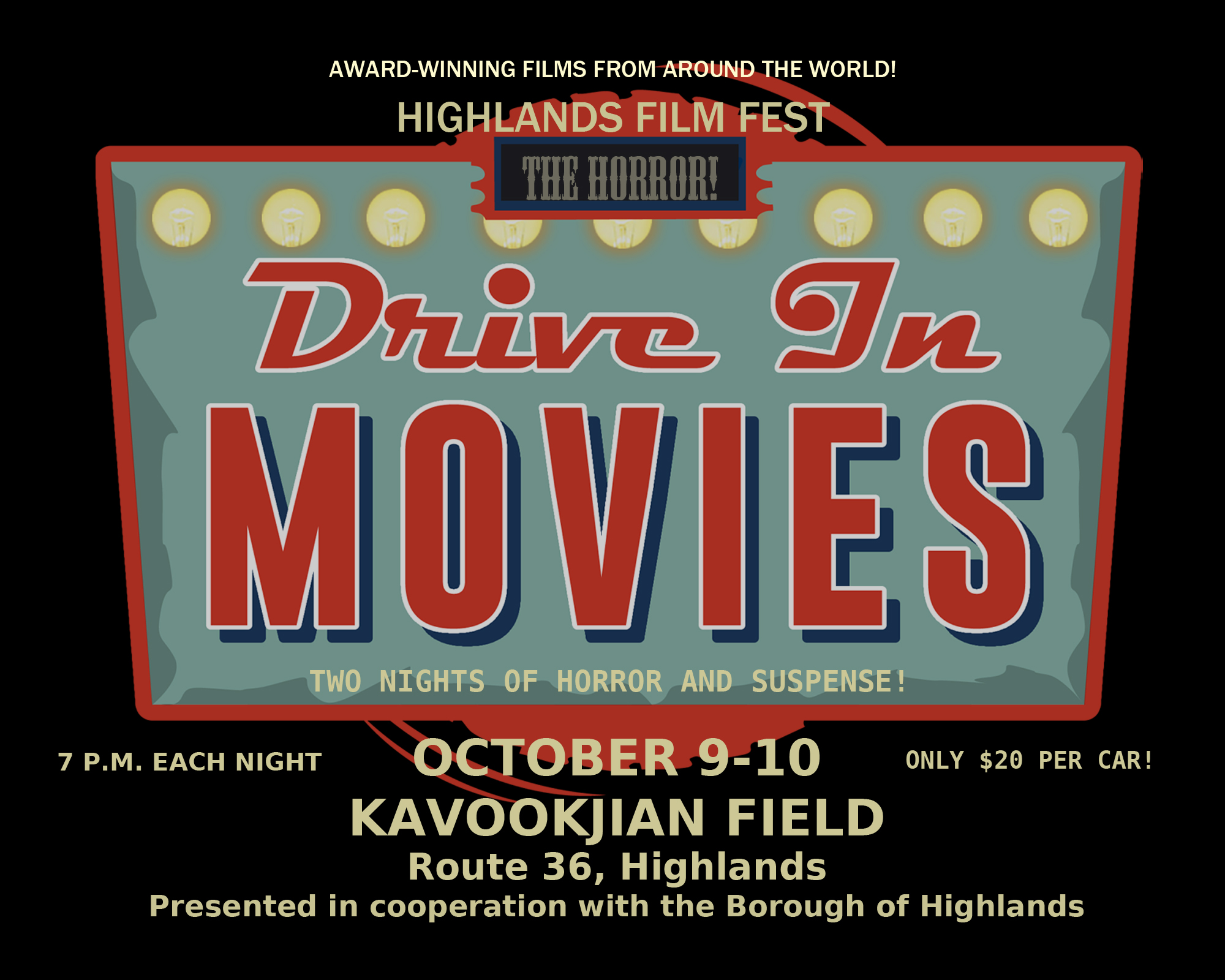 Highlands Film Fest and the Borough of Highlands present two nights of drive-in movies at Kavookjian Field. Theme: horror and suspense!