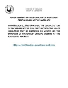 Legal Notices Ad 2026 Download File Type: pdf File Size: 48 KB Categories: Mayor and Council Legal Notices Borough of Highlands2026-03-30T10:05:39-04:0003/30/2026|Comments Off on Legal Notices Ad 2026 Share This Story, Choose Your Platform! FacebookXBlueskyRedditLinkedInWhatsAppTelegramTumblrXingEmailCopy Link