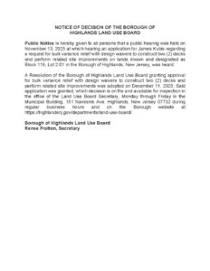 Notice of Decision Kubis Resolution Download File Type: pdf File Size: 62 KB Categories: Land Use Board Legal Notices Borough of Highlands2026-04-10T06:53:38-04:0004/10/2026|Comments Off on Notice of Decision Kubis Resolution Share This Story, Choose Your Platform! FacebookXBlueskyRedditLinkedInWhatsAppTelegramTumblrXingEmailCopy Link