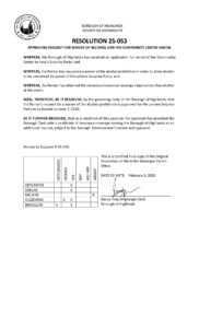R 25 053 Waiver of Alcohol Ban for Community Center Rental Download File Type: pdf File Size: 56 KB Categories: 2025 Resolutions Borough of Highlands2025-12-05T07:20:16-05:0012/05/2025|Comments Off on R 25 053 Waiver of Alcohol Ban for Community Center Rental Share This Story, Choose Your Platform! FacebookXBlueskyRedditLinkedInWhatsAppTelegramTumblrXingEmailCopy Link