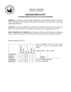R 25 077 Accepting Donation of Police Dog Safety Equipment Download File Type: pdf File Size: 67 KB Categories: 2025 Resolutions Borough of Highlands2025-12-05T07:20:16-05:0012/05/2025|Comments Off on R 25 077 Accepting Donation of Police Dog Safety Equipment Share This Story, Choose Your Platform! FacebookXBlueskyRedditLinkedInWhatsAppTelegramTumblrXingEmailCopy Link