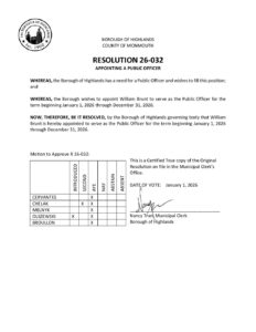 R 26 032 Appointing a Public Officer Download File Type: pdf File Size: 55 KB Categories: 2026 Resolutions Borough of Highlands2026-01-05T11:11:12-05:0001/05/2026|Comments Off on R 26 032 Appointing a Public Officer Share This Story, Choose Your Platform! FacebookXBlueskyRedditLinkedInWhatsAppTelegramTumblrXingEmailCopy Link