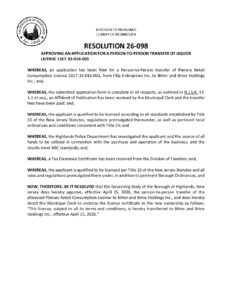 R 26 098 Approving Person To Person Transfer of Liquor License 1317 33 016 003 Download File Type: pdf File Size: 67 KB Categories: 2026 Resolutions Nancy Tran2026-04-16T12:49:44-04:0004/16/2026|Comments Off on R 26 098 Approving Person To Person Transfer of Liquor License 1317 33 016 003 Share This Story, Choose Your Platform! FacebookXBlueskyRedditLinkedInWhatsAppTelegramTumblrXingEmailCopy Link