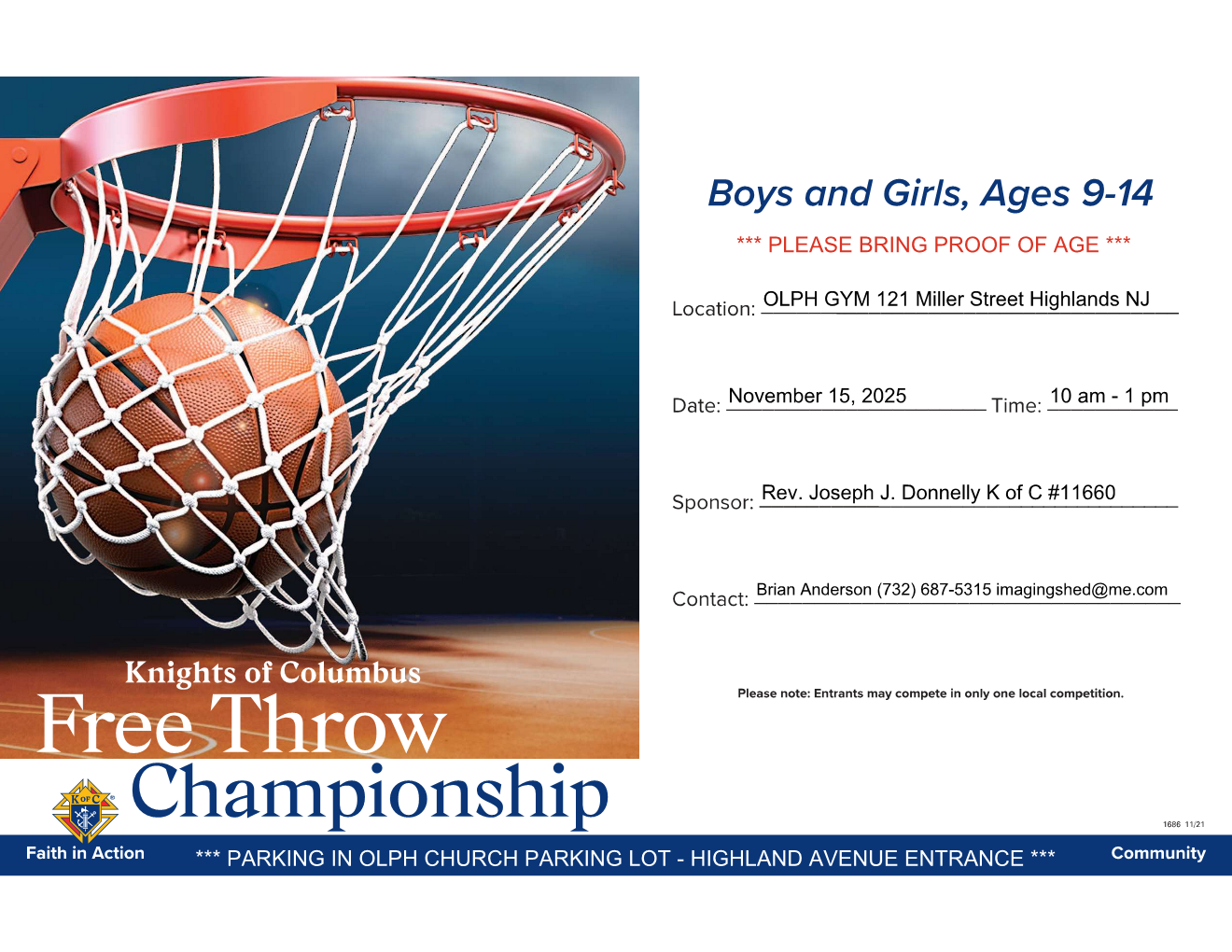 Knights of Columbus Free Throw Contest for Boys and Girls, Ages 9-14. For more info, contact Brian Anderson at (732) 687-5315 or imagingshed@me.com