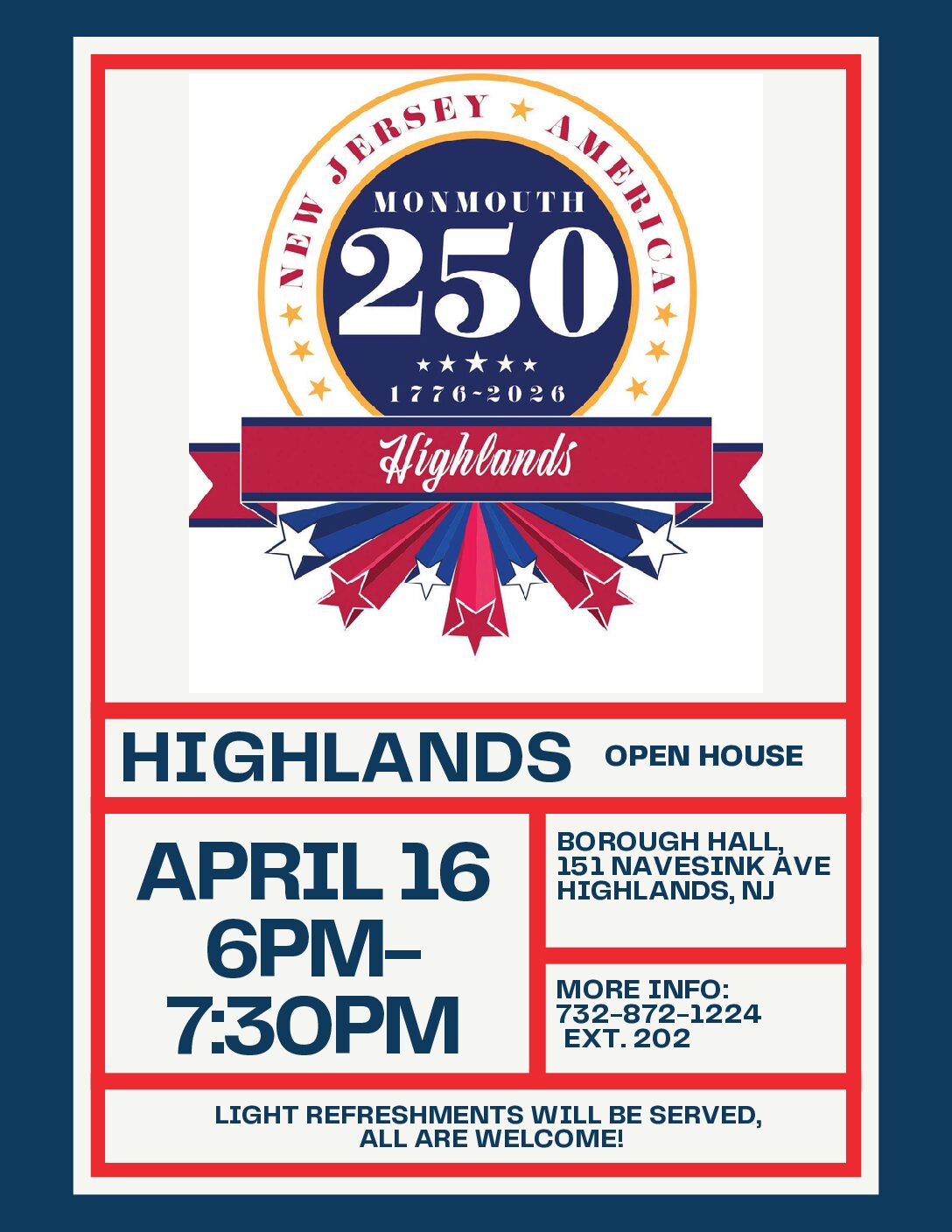 16apr6:00 pm7:30 pmLocal Government Week - Highlands Open House 6pm-7:30pmHighlands Open House, Highlands Borough Hall, 151 Navesink Ave. April 16th, 6pm-7:30pm. Please join us for light refreshments. Open to the Residents of Highlands & the Public.