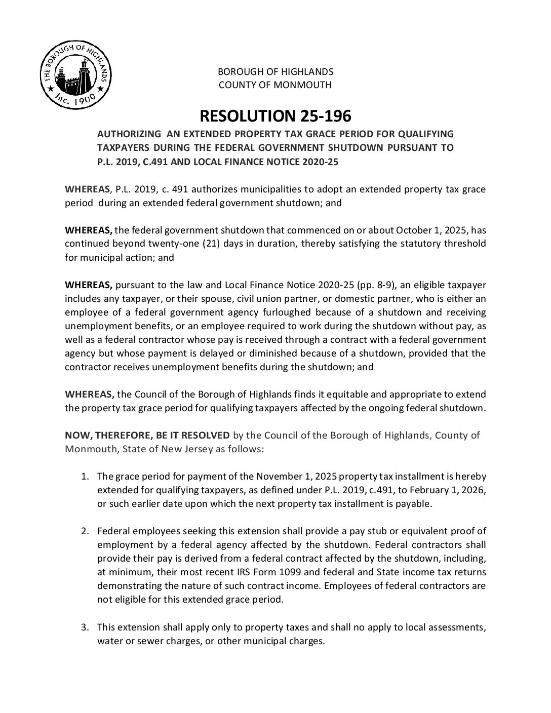R 25 196 Grace Period due to Federal Government Shut Down Gallery R 25 196 Grace Period due to Federal Government Shut Down R 25 196 Grace Period due to Federal Government Shut Down Borough of Highlands2025-12-05T07:20:14-05:0012/05/2025|Comments Off on R 25 196 Grace Period due to Federal Government Shut Down Read More