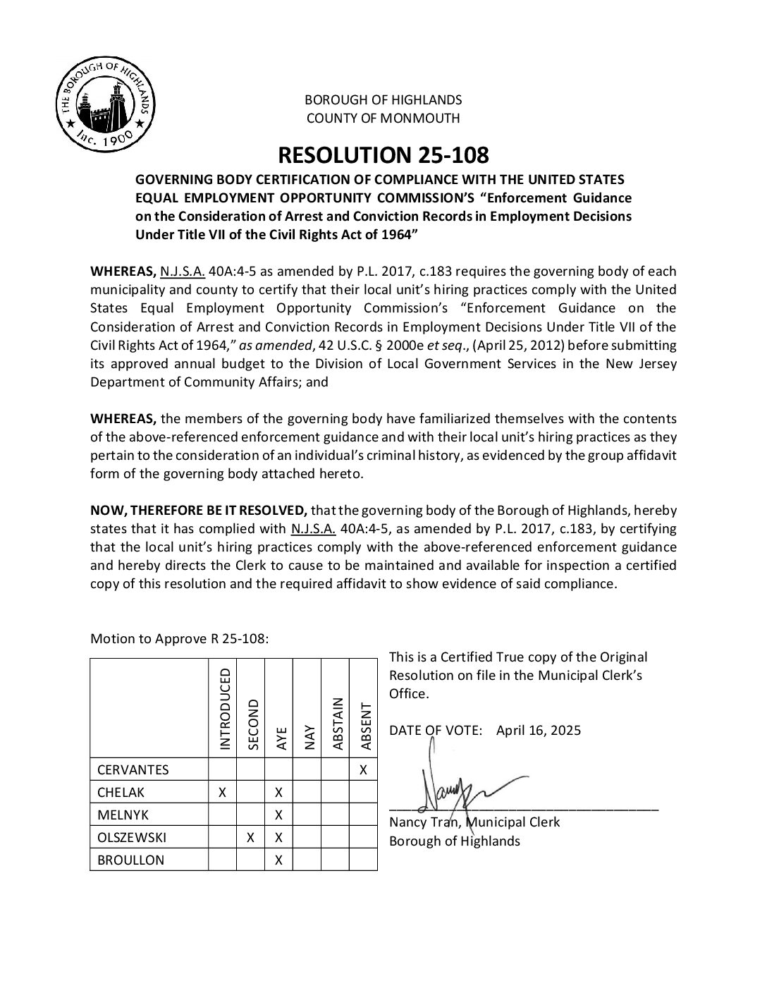 R 25 108 Governing Body Certification of Compliance with USEEOC Gallery R 25 108 Governing Body Certification of Compliance with USEEOC R 25 108 Governing Body Certification of Compliance with USEEOC Borough of Highlands2025-12-05T07:20:15-05:0012/05/2025|Comments Off on R 25 108 Governing Body Certification of Compliance with USEEOC Read More