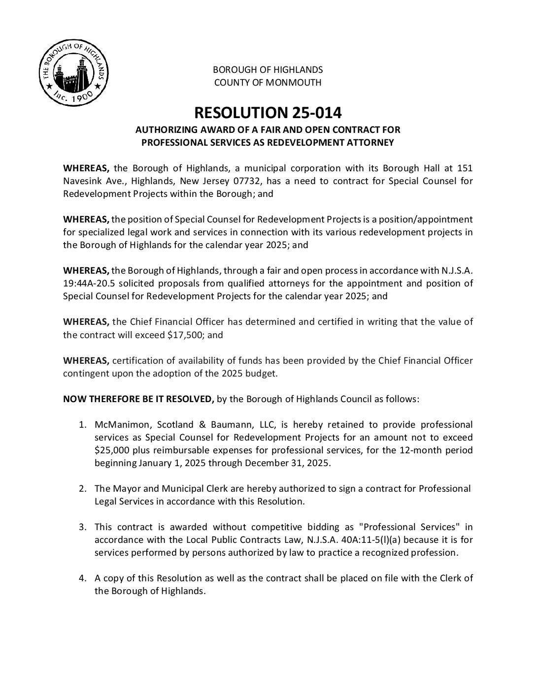 R 25 014 Appointing Redevelopment Attorney Gallery R 25 014 Appointing Redevelopment Attorney R 25 014 Appointing Redevelopment Attorney Borough of Highlands2025-12-05T07:20:51-05:0012/05/2025|Comments Off on R 25 014 Appointing Redevelopment Attorney Read More