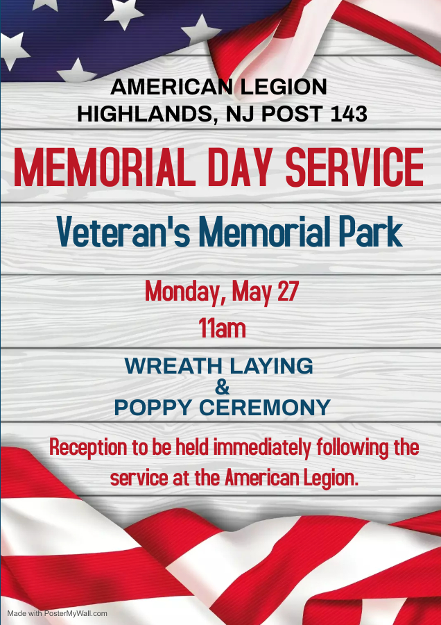 The Highlands American Legion, Post 143 will be hosting a wreath laying and poppy ceremony at the Veteran's Memorial Park in Highlands on Monday, May 27th at 11am.